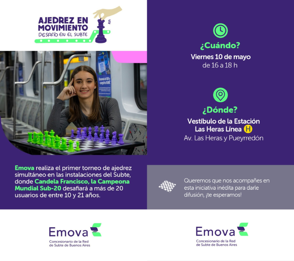 Emova realizará el primer torneo de ajedrez simultáneo en el Subte. Publicado el 2 mayo, 2024 por Alberto Pérez 02 May Con la campeona mundial Sub-20, Candela Francisco Alberto Pérez En 10 años se triplicaron los dispositivos conectados a Internet 28 de abril – Día Mundial de la seguridad y la salud en el trabajo Luchemos por la Vida brindó capacitaciones