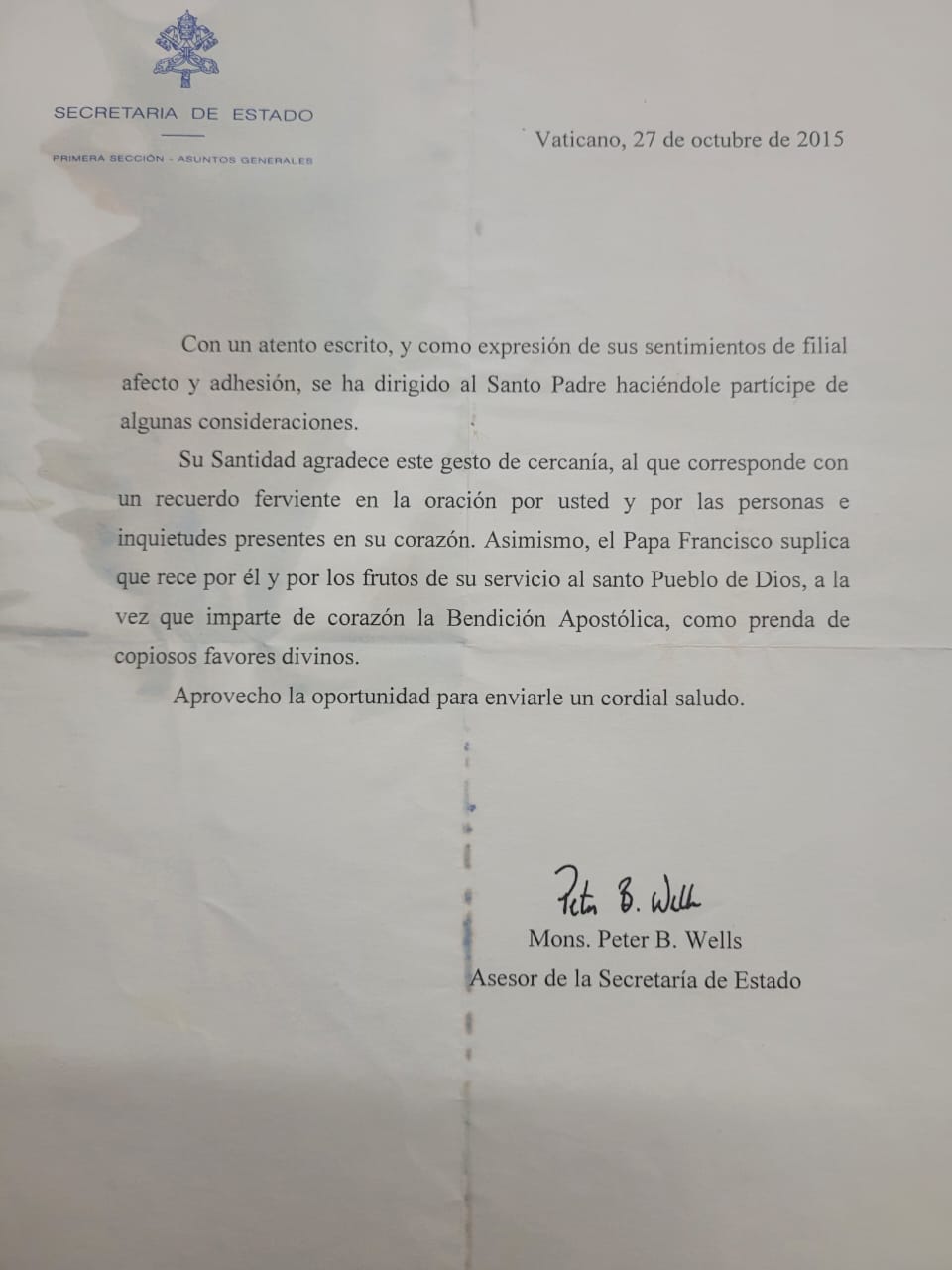 Aquel gesto fue recibido con calidez y, semanas después, llegó una respuesta oficial desde la Secretaría de Estado del Vaticano. En la misiva, firmada por Mons. Peter B. Wells, se agradece el testimonio de cercanía y se transmite la Bendición Apostólica como prenda de copiosos favores divinos.