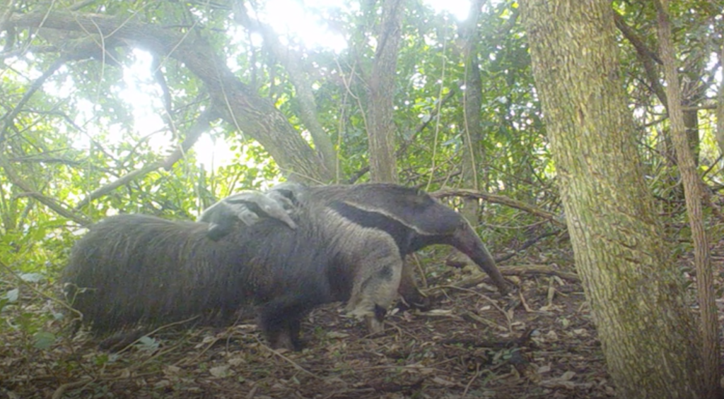 La semana pasada, las cámaras-trampa colocadas en el Parque Iberá registraron a la adre con sus dos crías en el lomo, un espectáculo muy singular. En Argentina no hay ningún registro previo de este tipo, y en vida silvestre solo conocemos un registro de osos hormigueros mellizos que ocurrió en el Pantanal Sul en el Mato Groso, en Brasil, donde trabaja la organización Onçafari.